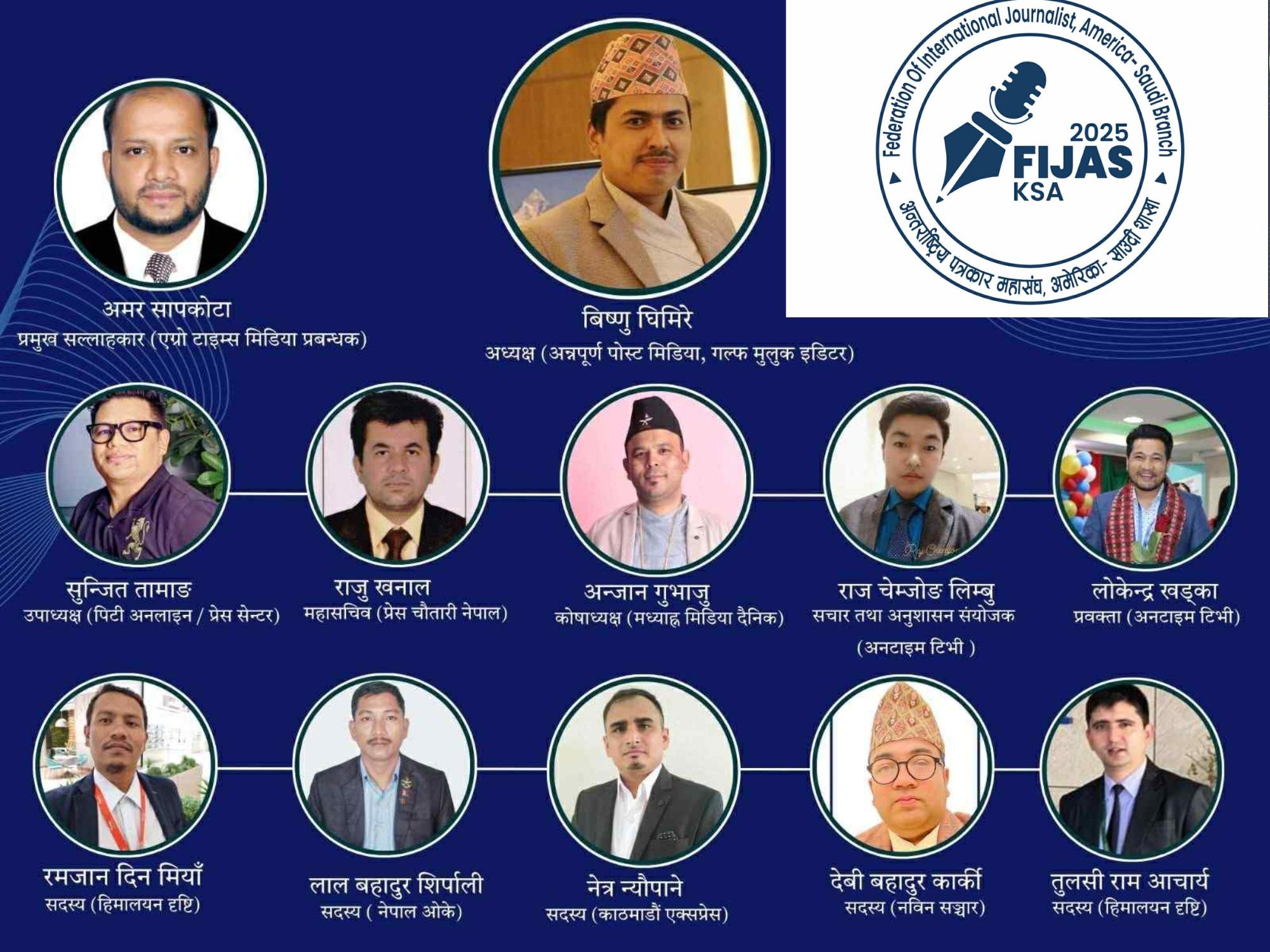 रियाद (साउदी अरबिया): अन्तर्राष्ट्रिय पत्रकार महासंघ अमेरिका (FIJA) को साउदी अरब शाखा औपचारिक रूपमा गठन भएको छ। फेडरेसनको केन्द्रीय कार्यालयसँग परामर्श र सहमतिपछि साउदी अरबमा कार्यरत नेपाली पत्रकारहरूको भेलाबाट उक्त शाखा गठन गरिएको हो।