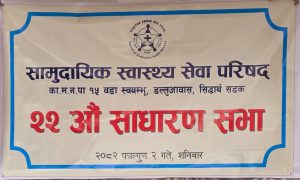 काठमाडौँ, २ फागुन । सामुदायिक स्वास्थ्य सेवा परिषद् अन्तर्गत सञ्चालित स्वयम्भू सामुदायिक अस्पतालको २२औँ वार्षिक साधारण सभा शनिबार डल्लु आवासस्थित अस्पताल परिसरमा सफलतापूर्वक सम्पन्न भएको छ। परिषद्का अध्यक्ष हरीगोपाल श्रेष्ठको अध्यक्षतामा सम्पन्न उक्त सभाले आगामी कार्यकालका लागि श्री केशर बहादुर मानन्धरको अध्यक्षतामा नयाँ कार्यसमिति निर्विरोध चयन गरेको छ।