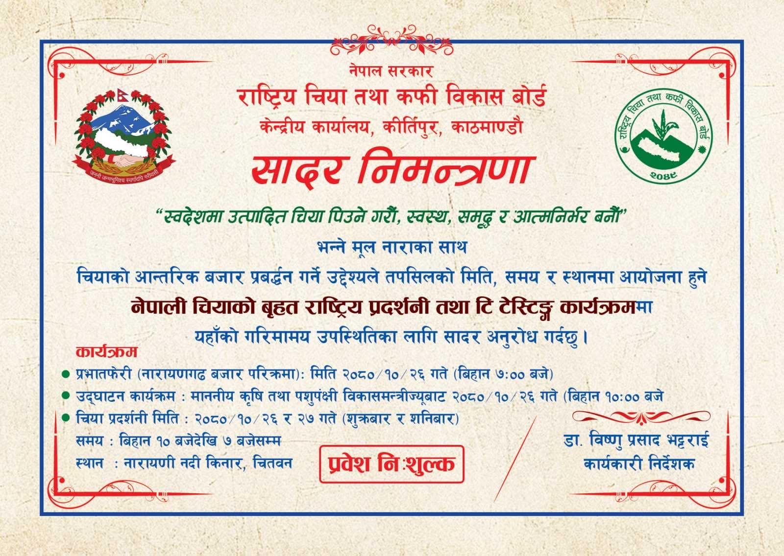 नेपाली चियाको वृहत राष्ट्रिय प्रदर्शनी तथा टि–टेस्टिङ कार्यक्रम चितवनमा संचालन गरिँदै
